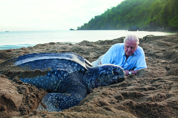 David Attenborough with a leatherback turtle in Trinidad and Tobago, in a photo taken by Gavin Thurston.[Photo provided to China Daily] |