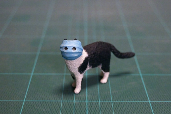 The cat is wearing a blue mask with eye holes cut out of it, supposedly to protect it from the novel coronavirus, a condition that mainly affects people.