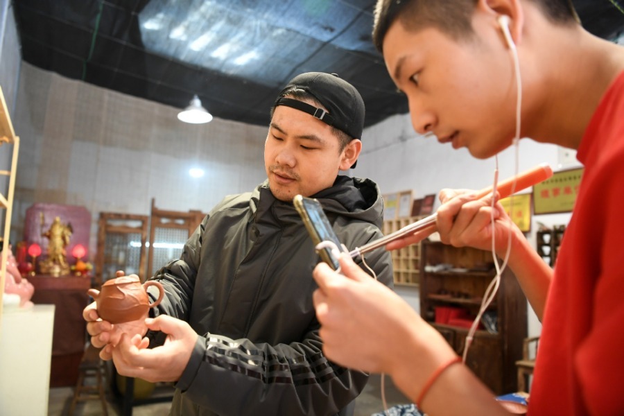 A craftsman introduces pottery works and the craft skill to audience members via livestreaming, April 24, 2020. An ancient town in Rongchang district of Chongqing municipality held a livestreaming event to promote local landscape as well as its time-honored pottery culture. Rongchang pottery-making craft was named as a national-level intangible cultural heritage in 2011. [Photo/Xinhua]
