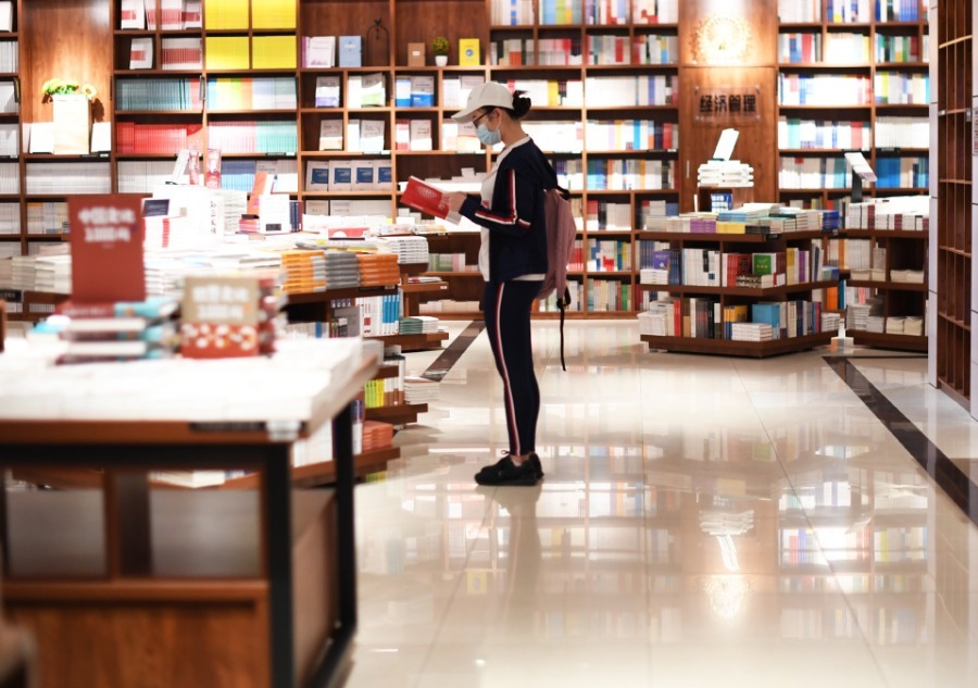 A young woman reads at Xinhua Bookstore in Chongqing on April 26, 2020. The 25th World Book and Copyright Day was celebrated on April 23 last week, and Chongqing municipally launched a "reading month" campaign to encourage people to read more. A series of events including reading exhibitions and online "reading marathon" contests are scheduled. The campaign will last till the end of May.[Photo/Xinhua] |