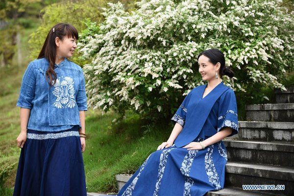 Ran Guangjin (R) poses for a photo for advertising in Fengxiang batik clothing in Duyun city, SW China's Guizhou province, May 6, 2019. [Photo/Xinhua] |