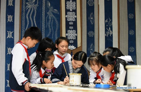 Ran Guangjin (C) gives students instruction in Fengxiang batik painting techniques at her workshop in Duyun city, SW China's Guizhou province, May 6, 2019. [Photo/Xinhua] |