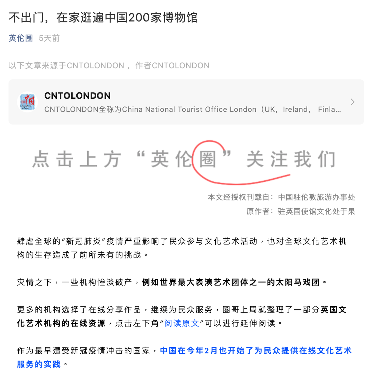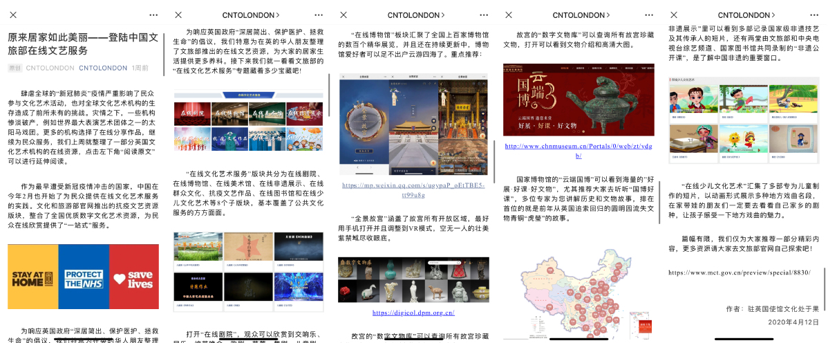 The WeChat official account CNTOLONDON has been playing an active role in Britain, providing abundant cultural resources to Chinese people in the country during the lockdown since March.
