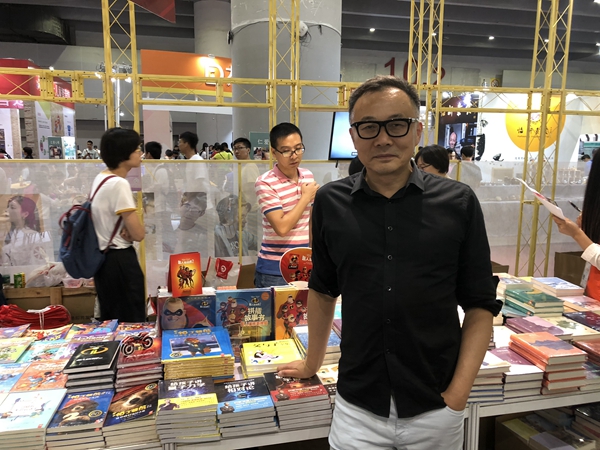 Li poses with a selection of his work at a book festival in Guangdong province in 2018.[Photo provided to China Daily] |