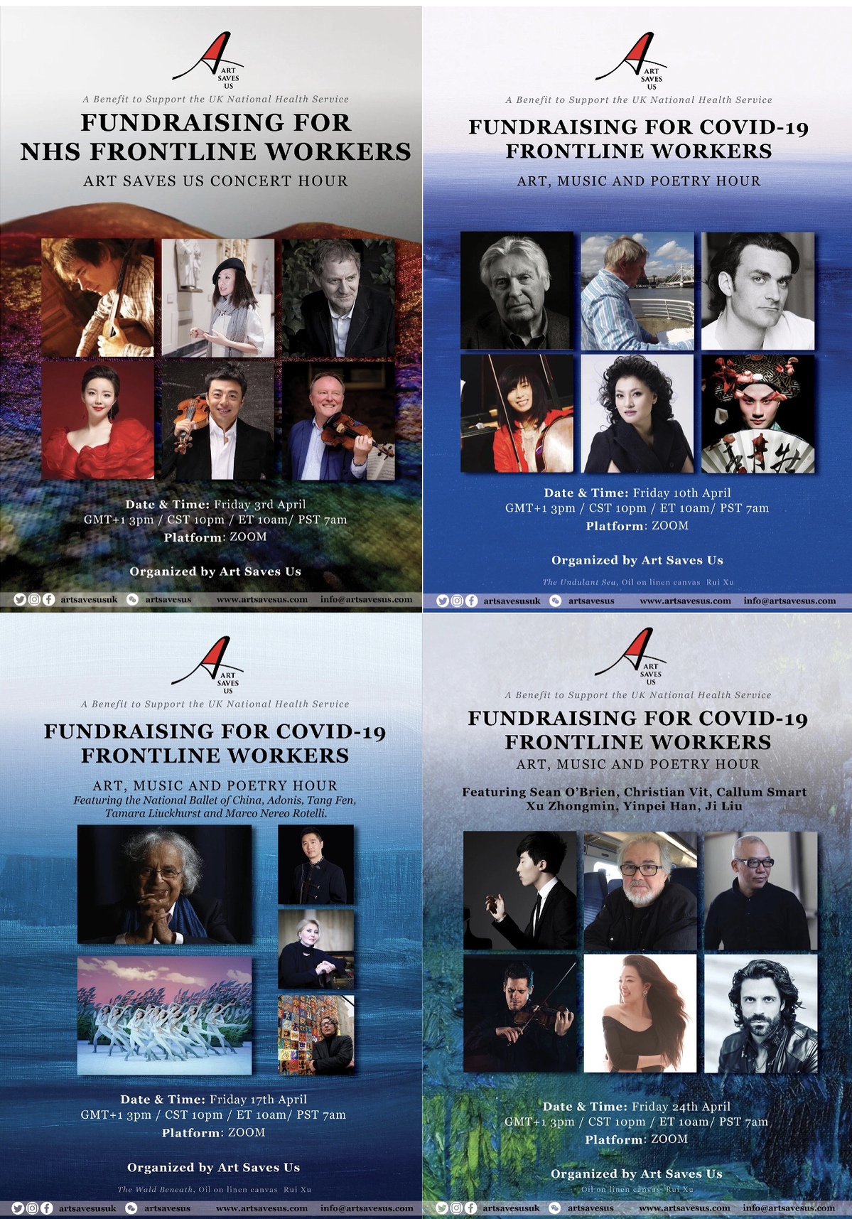 Art Saves Us, a weekly online performance to raise funds for COVID-19 frontline workers of the UK's National Health Service was launched on April 3.