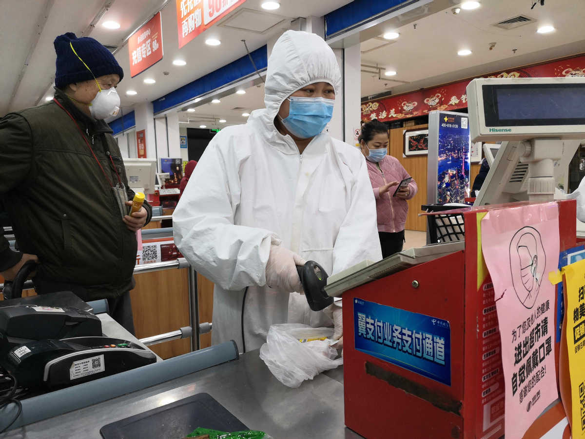 A consumer bills purchases at a Wumart outlet in Beijing. The store has limited passenger flows to avoid crowds and reduce infections. DU JIANPO/FOR CHINA DAILY |