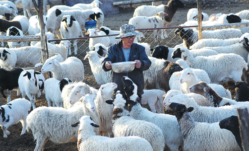Zhu tends to his sheep in the yard on March 14.ZHAO DONGSHAN/ZHANG ZHAOWEI/FOR CHINA DAILY