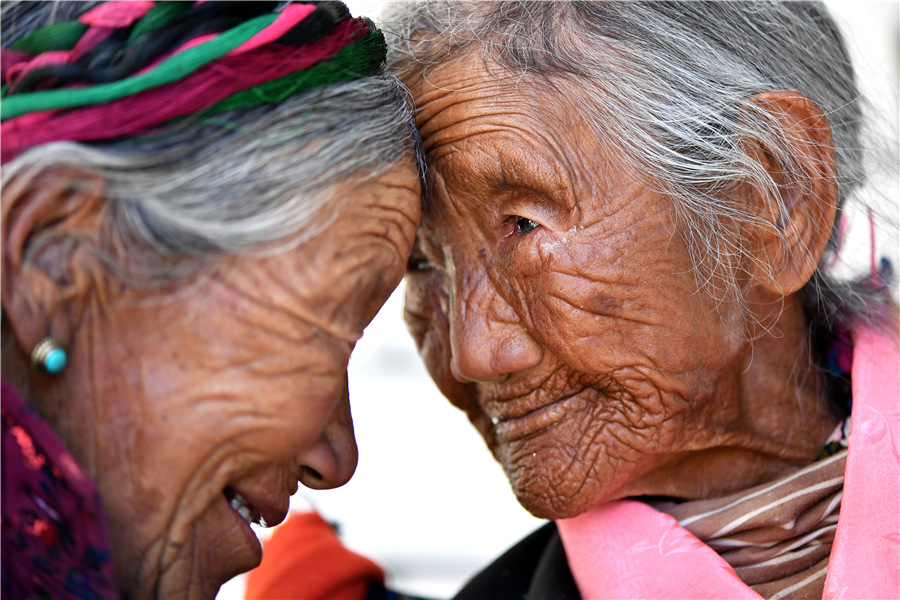 109-year-old Sonam Drolma (right) and her younger sister Tsering conduct a head-to-head ritual in Ragor village of Gyatsa county in Lhokha city, Tibet autonomous region, on March 24. [Photo/Xinhua]
