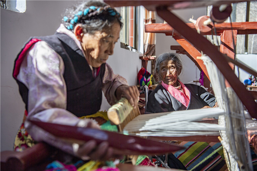 Tsering Zompa (left) weaves pulu fabrics accompanied by her mother Sonam Drolma on March 24. [Photo/Xinhua]