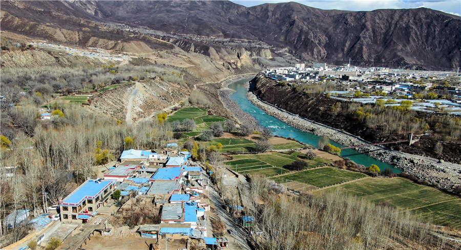 A drone photograph of Ragor village of Gyatsa county in Lhokha city, Tibet autonomous region, on March 24. [Photo/Xinhua]