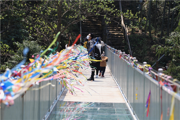 A tourist stops on a bridge to enjoy the scenery in Jingxian county, Anhui province on April 12. The bridge, built of steel and glass, is over a stream and leads to a mountain trail. [Photo by Zhu Lixin/China Daily] |