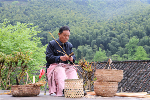 Zhou Guoping, a craftsman from Tingxi township of Jingxian, Anhui, knits baskets, which are still widely used by traditional local tea farmers, on April 19. [Photo by Li Chi/For China Daily] |