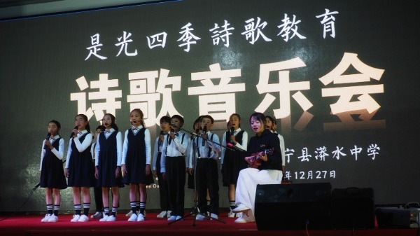 Youngsters from the Mangshui Middle School in Mangshui town, Yunnan province perform in their first poetry recital in December 2017.[Photo provided to China Daily] |
