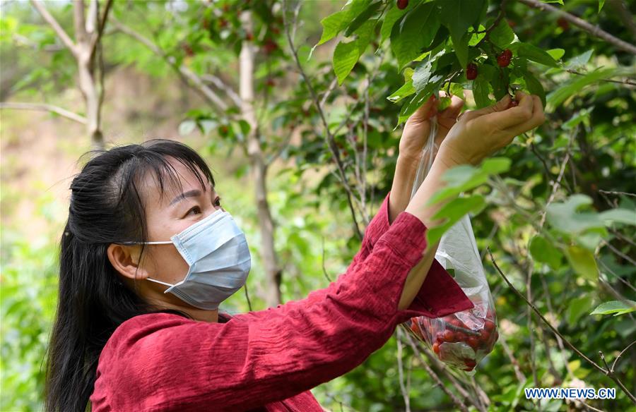 A tourist picks cherries during a cherry festival held at the Cherry Vale scenic area in Erqi District of Zhengzhou, Central China's Henan province, May 6, 2020. [Photo/Xinhua]