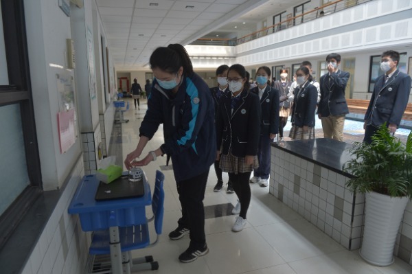 Students regularly sanitize their hands.[Photo by Cao Zichen/For China Daily]