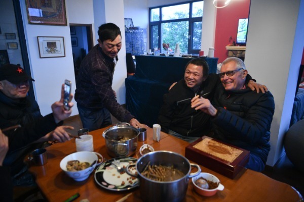 After dinner, Nijs takes out the cigars he has collected and share them with the construction workers.[Photo by Liu Ranyang/China News Service]