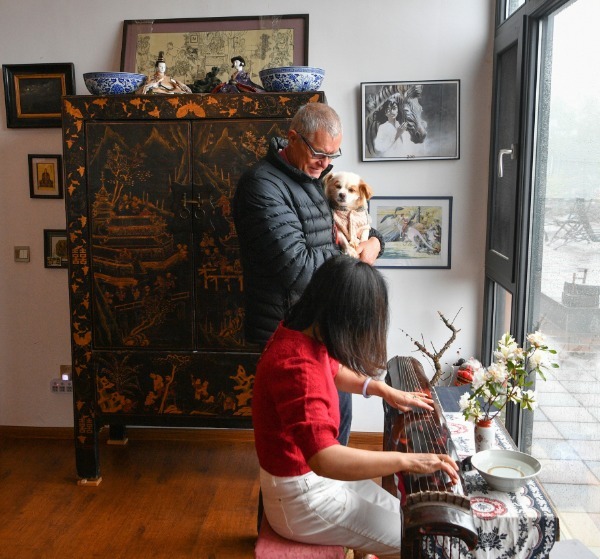 Nijs listens attentively while his wife plays the zither in the living room.[Photo by Liu Ranyang/China News Service]