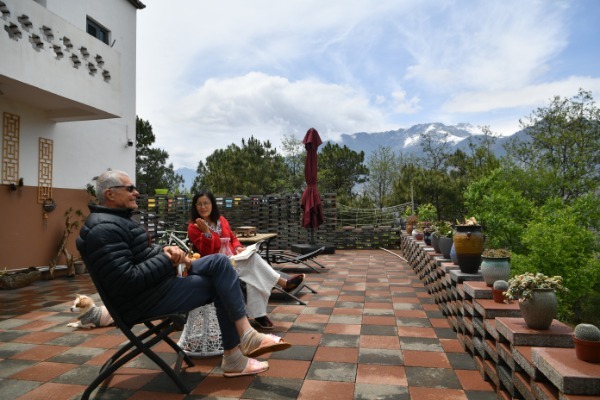 Patrick Nijs and his wife bask in the sunshine at their backyard.[Photo by Liu Ranyang/China News Service]