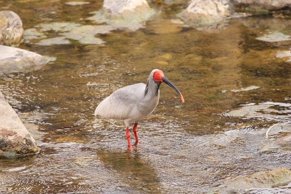 The crested ibis has white feathers, a red head and a black slender beak with a dash of red at the apex.[Photo provided to China Daily] |