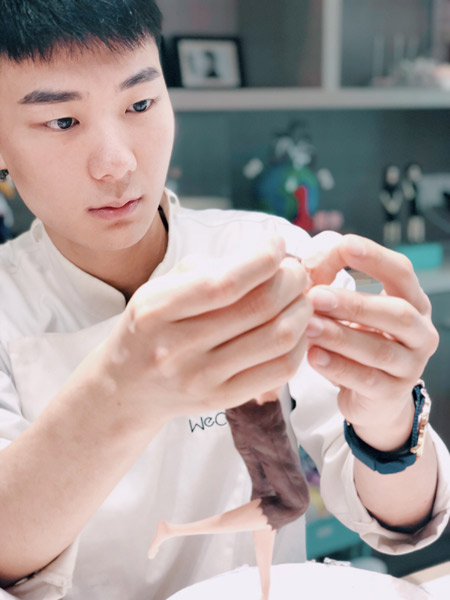 Zhou Fei makes an art piece with fondant at his studio in Hangzhou, Zhejiang province. [Photo provided to China Daily] |