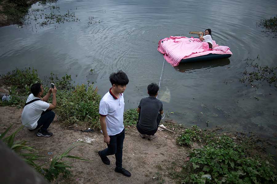 A girl steals the spotlight by promoting bedding products on a water bed. [Photo by Yang Yifan/China Daily]