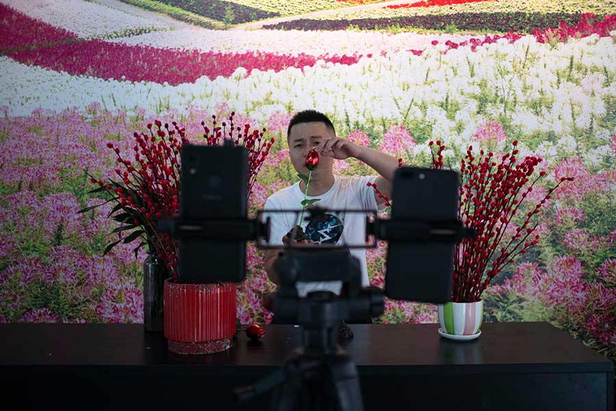 Li Meng sells flowers live in his own flower store. Li used to be an electric welder, and now he earns more than 50,000 yuan a month. [Photo by Yang Yifan/China Daily]