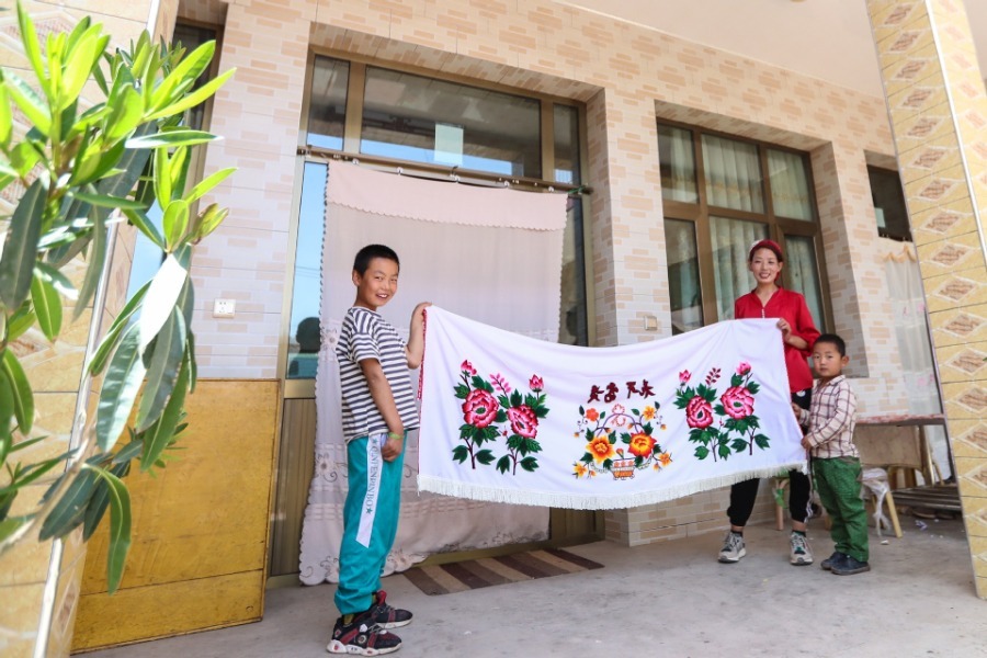 Ma Semai (C) shows her embroidery works at home in Daban town of Dongxiang autonomous county, Linxia Hui autonomous prefecture of Northwest China's Gansu province, May 30, 2020. Ma, 36-year-old and of the Dongxiang ethnic group, is one of the female embroiderers working in a traditional embroidery workshop established by local government as an approach to poverty reduction. The workshop has employed over 80 local women from the Dongxiang ethnic group who are good at embroidery, and has also attracted nearly 200 local female villagers to complete its orders at home.[Photo/Xinhua]