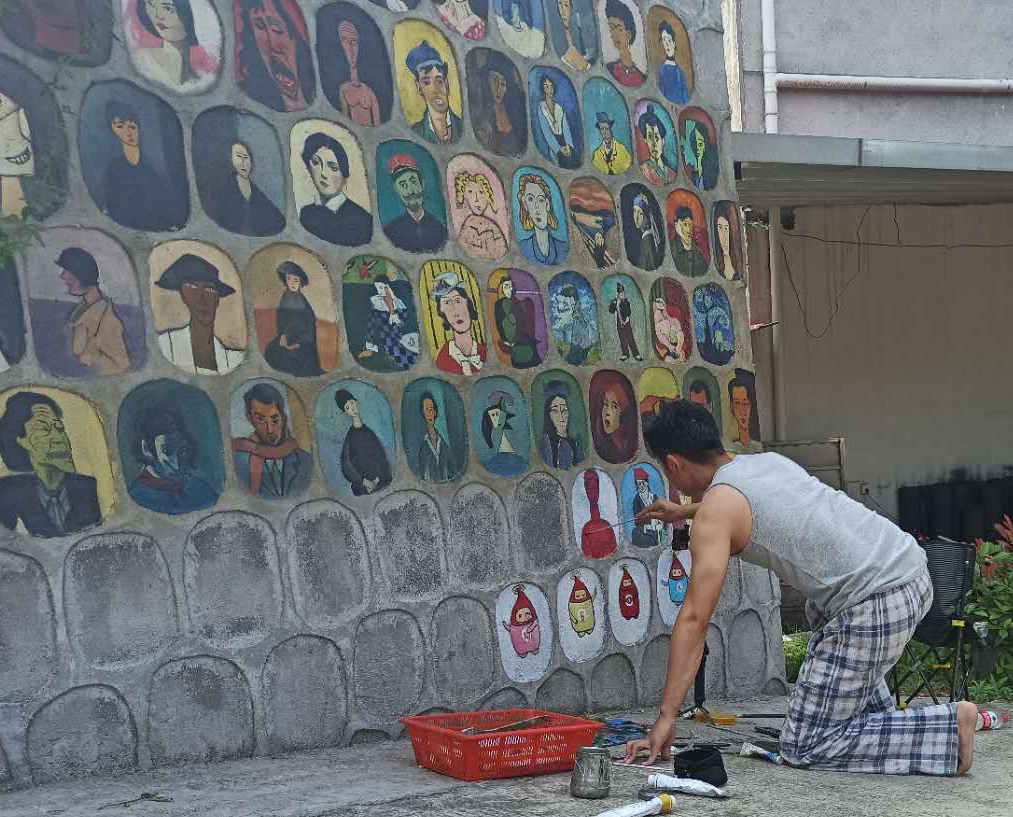 In the past four months, 22-year-old art student Liu Zhiwen created more than 150 copies of famous portrait paintings on a wall of his hometown of Daowu village, Central China's Hunan province.  [Photo provided to China Daily]