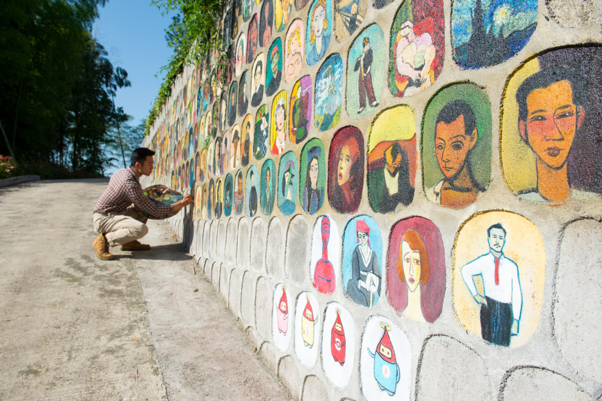 In the past four months, he has recreated more than 150 famous portraits on a wall in his hometown Daowu village, Central China's Hunan province.