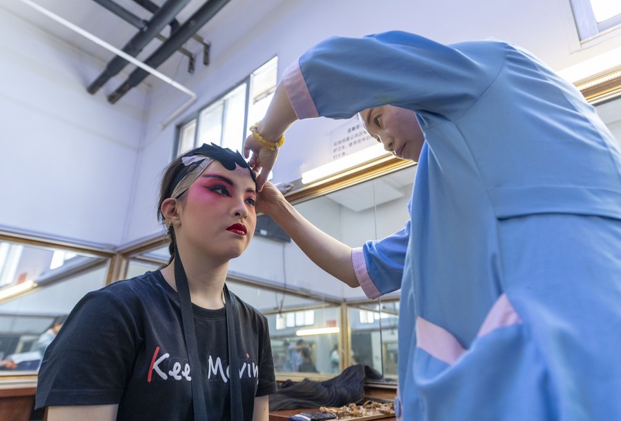 A teacher helps Du Sulinna (L) to wear a headwear at the dressing room in Yunnan Dian Opera Theatre in Kunming, Southwest China's Yunnan province, June 10, 2020. [Photo/Xinhua]