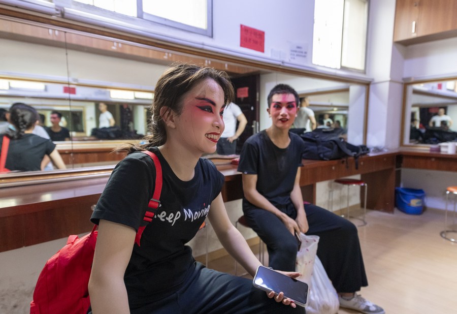 Du Sulinna (L) and her classmate Chen Longwei rest at the dressing room after training in Kunming, Southwest China's Yunnan province, June 10, 2020. [Photo/Xinhua]
