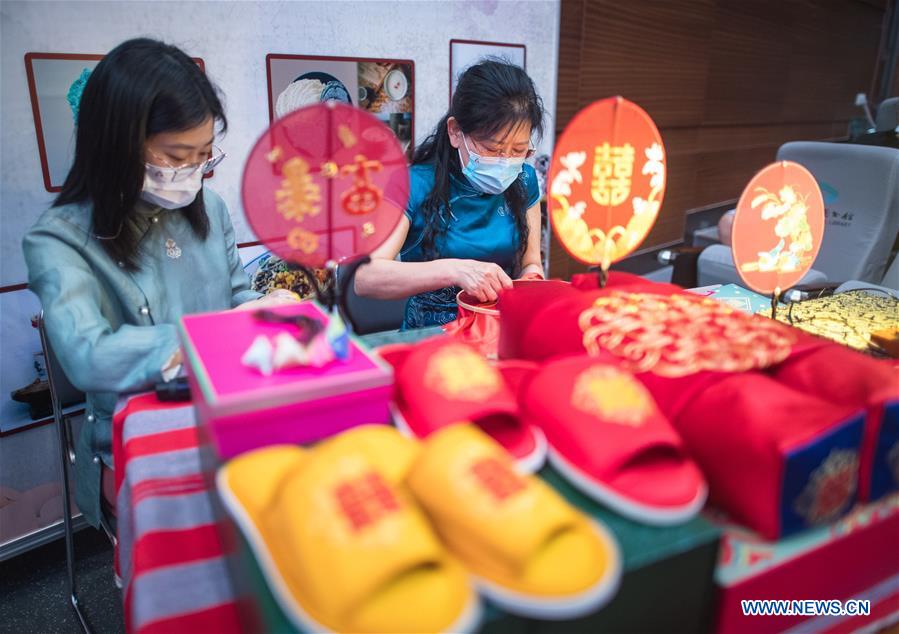 Embroidery artists show their skills during an intangible cultural heritage shopping festival at the Hubei Provincial Library in Wuhan, capital of Central China's Hubei province, June 11, 2020.[Photo/Xinhua]