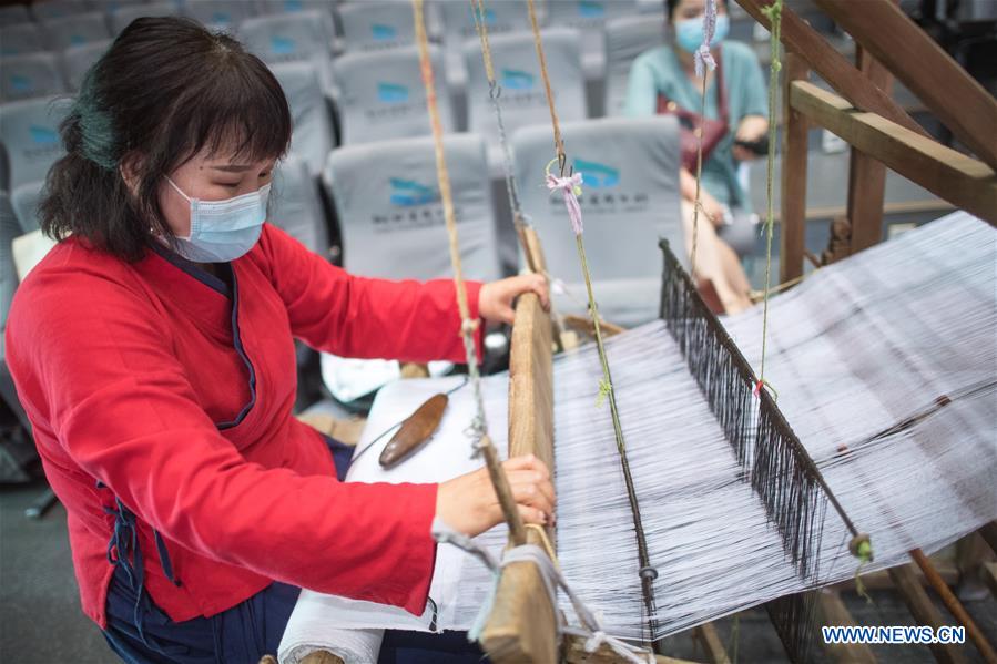 A coarse cloth craftswoman shows her skills during an intangible cultural heritage shopping festival at the Hubei Provincial Library in Wuhan, capital of Central China's Hubei province, June 11, 2020.[Photo/Xinhua] |