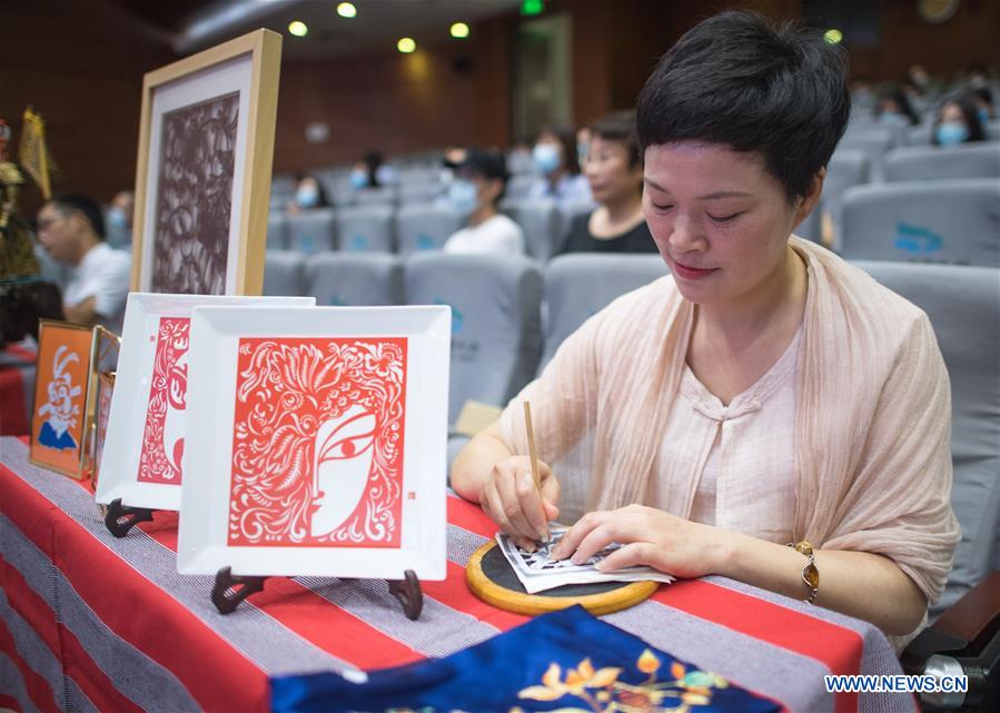Paper-cutting inheritor Cao Xiaoqin makes paper-cutting works during an intangible cultural heritage shopping festival at the Hubei Provincial Library in Wuhan, capital of Central China's Hubei province, June 11, 2020.[Photo/Xinhua] |