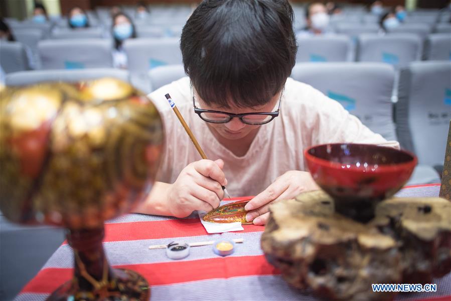 Lacquering artist Meng Xianggao makes handicraft during an intangible cultural heritage shopping festival at the Hubei Provincial Library in Wuhan, capital of Central China's Hubei Province, June 11, 2020.[Photo/Xinhua] |