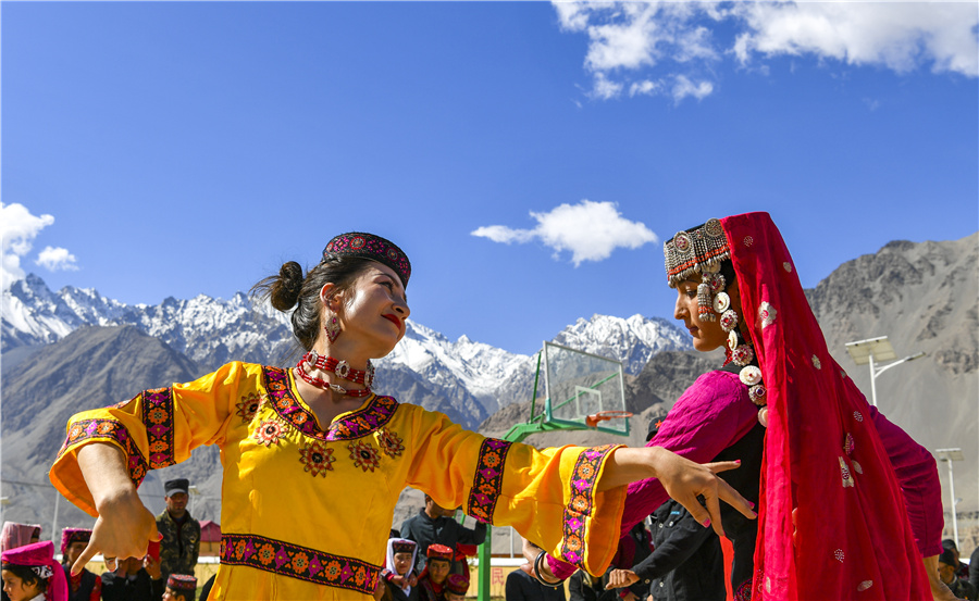 In the village of Resikamu, an actress of the Tashkurgan Cultural Troupe (left) dances with a villager. [Photo by Hu Huhu/Xinhua]