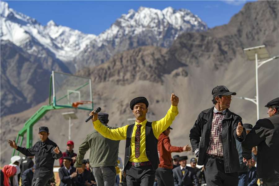 An actor (in a yellow shirt) sings the folk song I Love You, Motherland. [Photo by Hu Huhu/Xinhua]