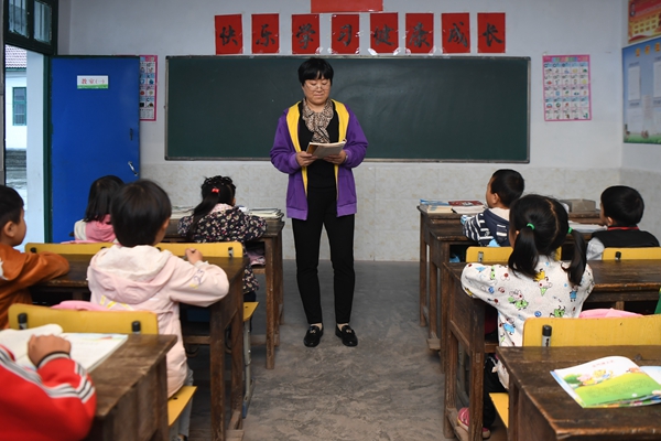 Yang Wenqing, the only teacher in a school in Dengyunzhai village, Luxi county, Hunan province, leads the students to read aloud a Chinese lesson.[Photo/Xinhua] |