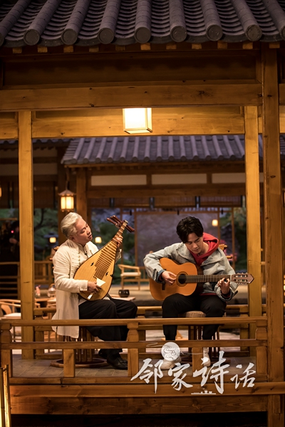 Chinese traditional musician Fang Jinlong (left) plays pipa with his son, indie musician Fang Songping, on guitar, in popular reality show Gems of Chinese Poetry.[Photo provided to China Daily] |