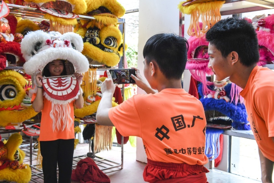 Tengxian county 's lion dance, which mimics a lion with martial and acrobatic styles, was listed as a national intangible cultural heritage in 2011.[Photo/Xinhua]