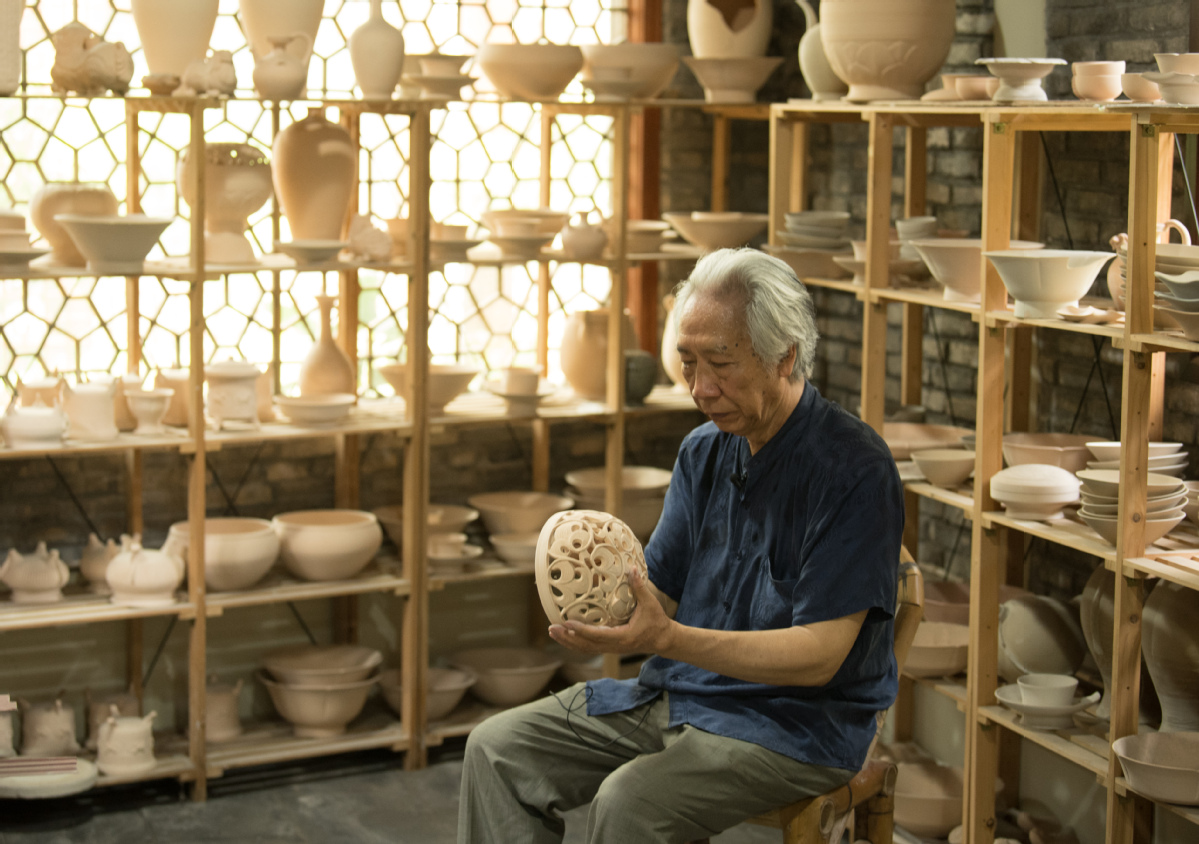Wen Changqing, born in 1949, has studied the craft of making mise porcelain since the 1980s. [Photo/Xinhua]
