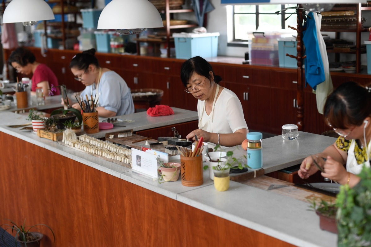 Craftsmen and craftswomen make Huzhou writing brushes at a workshop in Shanlian town, Huzhou city, East China’s Zhejiang province, June 17, 2020. [Photo/Xinhua]