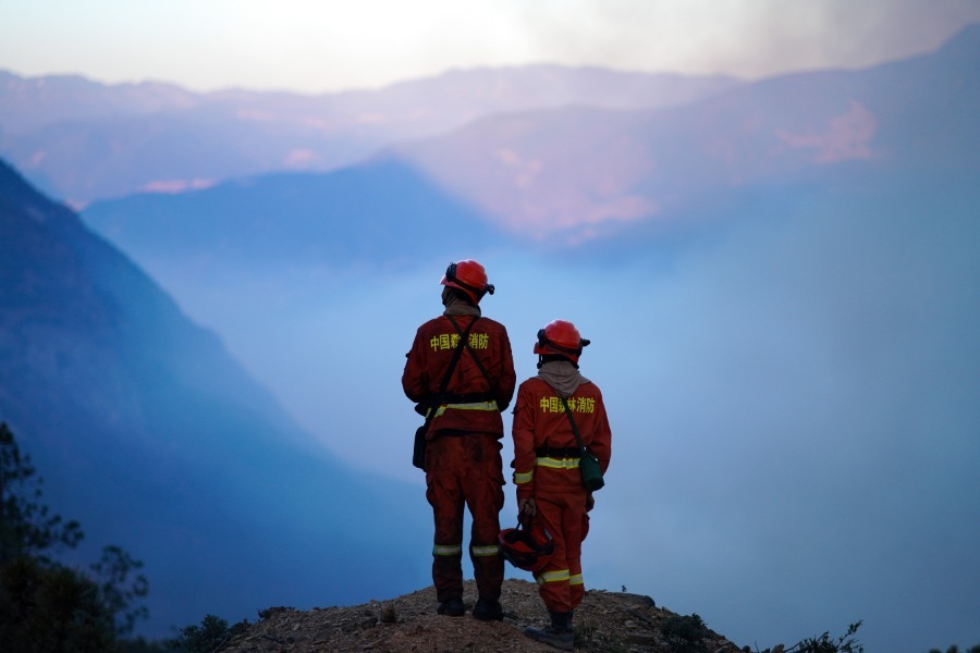 The firefighters stop the spread of a fire on the southern line. Two firefighters stand on a high hill and wait for the sun to rise, March 30.[Photo by Cheng Xueli/For China Daily]
