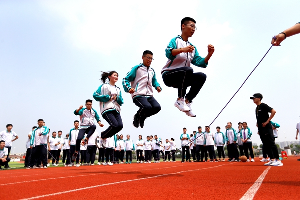 High school seniors in Qingdao, Shandong province, jump rope to blow off steam on June 14.[Photo/Xinhua] |