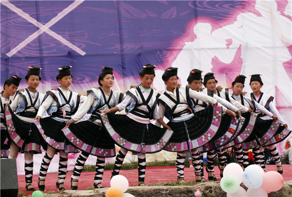 Women dressed in Miao ethnic clothing celebrate the festival in Dafang county, Guizhou province, in June 2007. [Photo by Zhang Jing/For China Daily] |