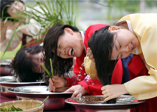 Participants in a festival ceremony wash their hair with calamus water in Jeonju, South Korea, in June last year. [Photo provided to China Daily] |