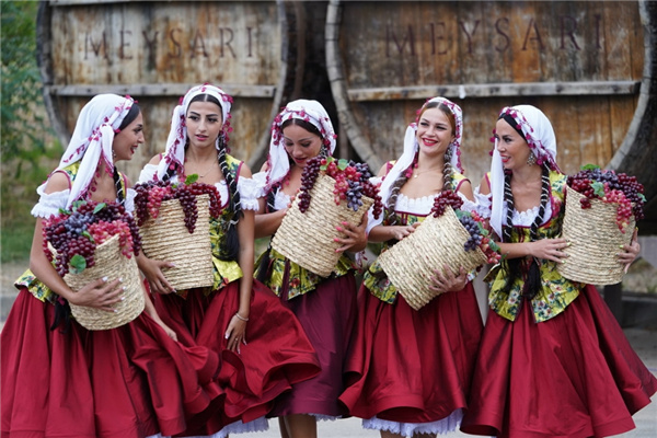 Local young women perform at the Grape and Wine Festival in Shamakhi in August 2019. [Photo by Ren Qi/China Daily] |