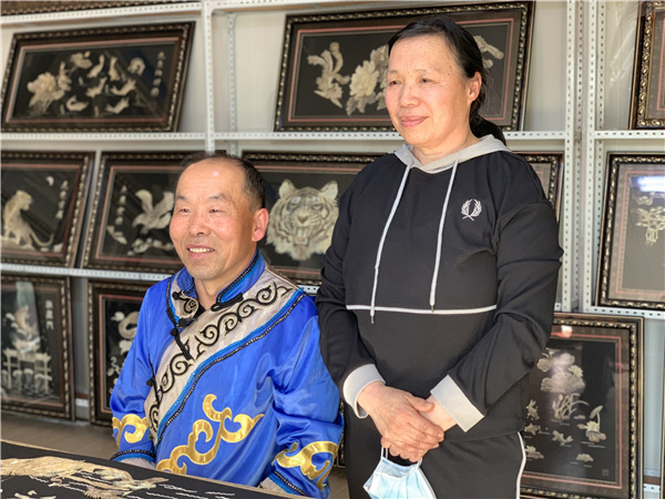 Sun Yulin, a representative inheritor of Hezhe fishskin art from Heilongjiang province, and his wife pose with their works. [Photo provided to China Daily] |