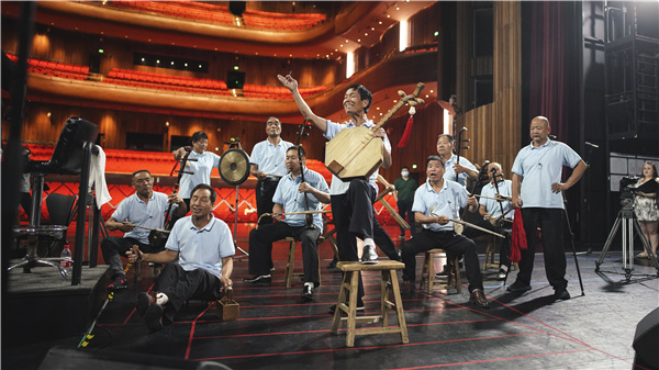 Artists of Huayin Laoqiang rehearse at Shaanxi Opera House on Tuesday. They will perform at a concert to be held on the west peak of Huashan Mountain on Saturday. [Photo provided to China Daily] |