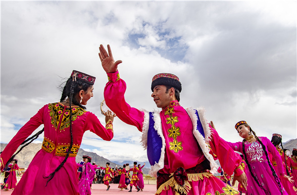 Performers dance at a local cultural event in Tashikurgan Tajik autonomous county in Xinjiang on June 25. [Photo/Xinhua] |